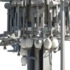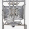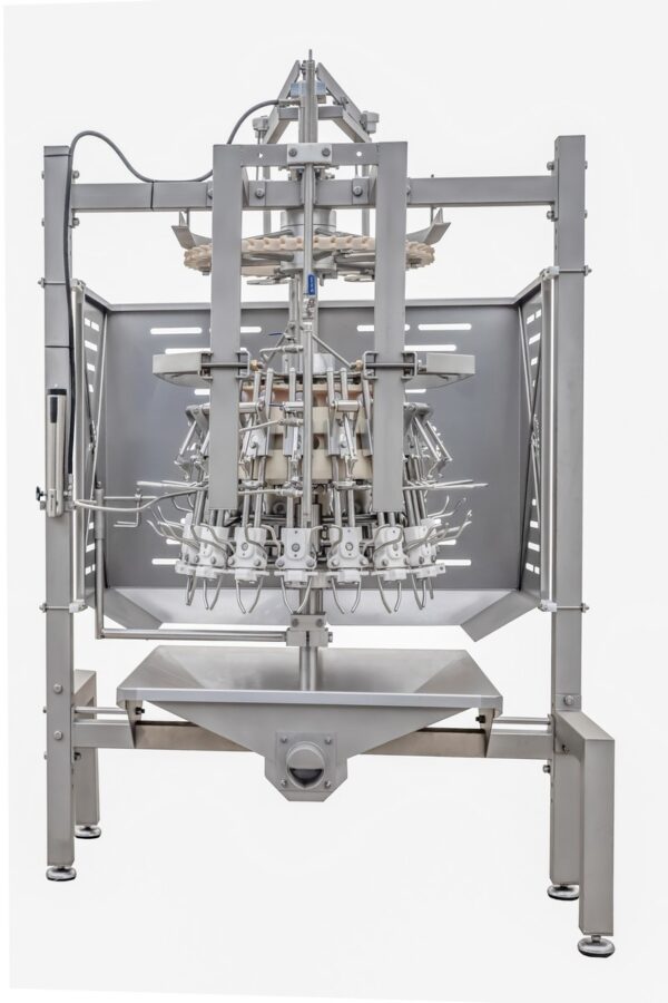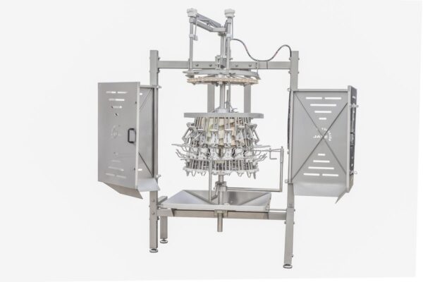 The carcasses are fed into the machine facing the chest outwards and the back towards the centre of the machine. The machine is a carousel type, driven by an overhead conveyor. The knife unit, equipped with an exceptionally sharp knife, ensures a uniform and clean cut. The knife holder is designed in such a way that the entrails are pushed out of the cutting line, preventing contamination. The cutting heads are washed and cleaned after each circular movement.