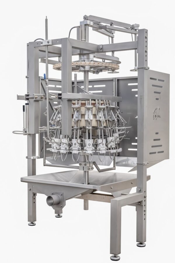 The machine is used to automatically cut the skin from the steak to the breastbone, starting from the hole made by the steakhouse. The machine is placed second in the evisceration line after the steakhouse.