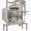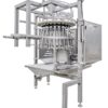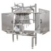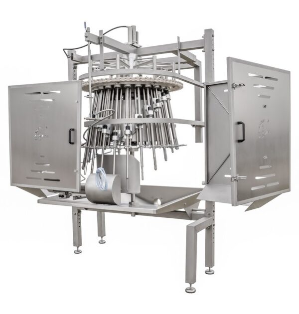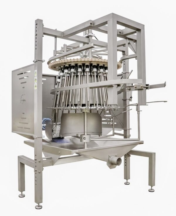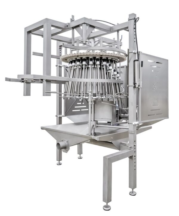 The carcasses are introduced into the machine facing outwards with their chest and back towards the centre of the machine. A guide rail, located on the bottom guide, introduces the chickens into the leg guide where they are fixed. The cleaning rod is inserted into the chicken using a slide block. The rotation of the cleaning rod will start after it enters the chicken and will advance up to the throat. Underneath the chicken, the cleaning rod is cleaned with a brush during its rotation. After cleaning, the rotation stops and the cleaning rod is pulled out of the chicken.
