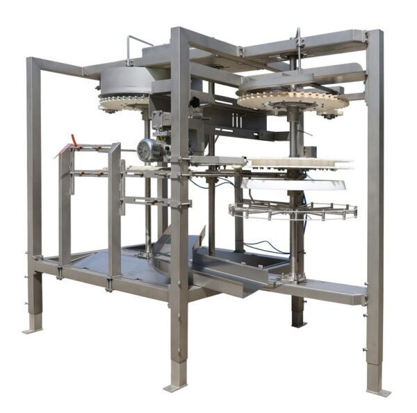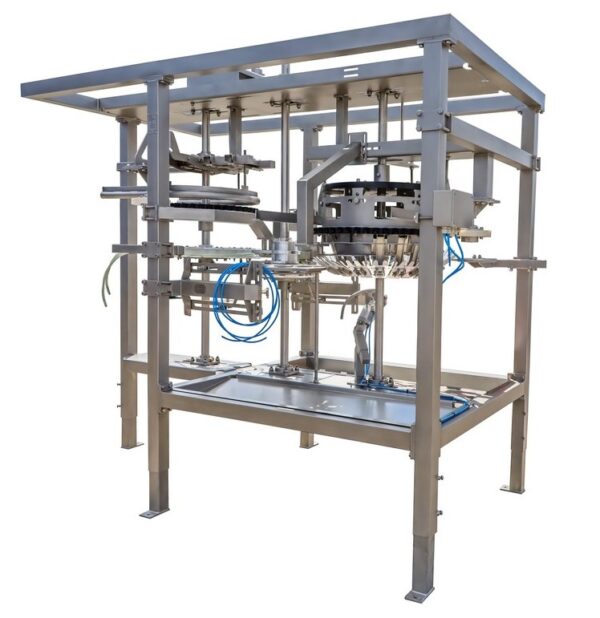 The carcass re-hanger is used to automatically trim the feet and re-hang the carcass from the slaughter line to the evisceration line. The weight range of the chickens is 800 g to 2,500 g, bearing in mind that the weight of a batch of chickens should be comparable in order for the hanging unit to work properly.