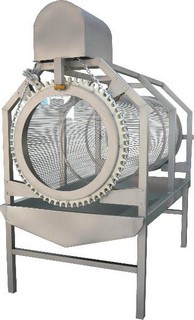 The basic unit of the separator is a rotating drum made of rods set on rollers. There is a drip chute at the bottom of the drum. The separator is driven by a motoreducer with a motor, which is mounted in the upper part of the frame. The torque is transmitted to the cylindrical screen via a 1″ technical chain. The carcasses move to the outlet after the water has been separated from them. The length of the separator depends on the capacity of the unit.