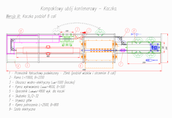 The compact container slaughterhouse contains all the necessary equipment for slaughtering poultry. The base is a stainless steel frame to which the equipment is mounted and an overhead conveyor with stirrups matched to the type of poultry. The system fits into a standard 40-foot container and, to start up, a water supply and electrical connection are required. A control cabinet, integrated into the system, allows easy control of the slaughtering process.