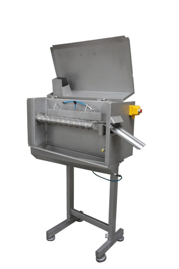 Stripped of the heart and liver, the intestinal packet is passed through a dropping funnel onto rollers which position and then cut the intestines from the stomach. The intestines slide down the drain chute straight to their destination, while the stomach hits a separate chute that brings it to its final destination.