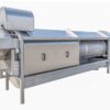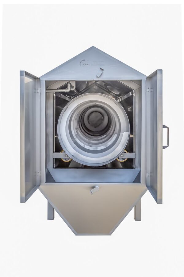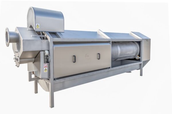 The basic unit of the separator is a trough-shaped body containing a cylindrical sieve in a horizontal position, mounted on rollers. In the lower part of the body there is a drip tray, the drive is installed in the upper part – when actuated, it rotates the cylindrical sieve. Waste or feathers are fed into the sieve, where they are separated from the water and move to the outlet. A scrubber is installed above the screen.