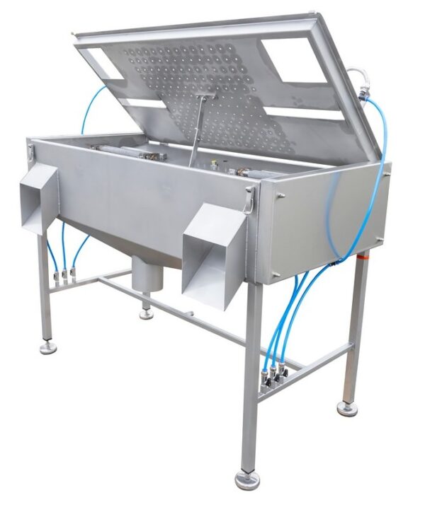 The dissected stomach is manually fed by the machine operator onto a set of counter-rotating plastic cleaning rollers. It is recommended to set up the CZ-1 cleaner in a combination with the MC gastric cleaner and degelatiniser, due to the best gastric cleaning results and increased processing capacity. The use of such a combination also has an impact on the durability of the device, in particular on the service life of the