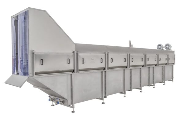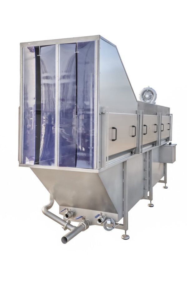 Slaughtered and bled birds are transported to the scalding device on the slaughter conveyor’s stirrups. In the scalding tank, the bird is immersed in hot water for a sufficiently long period of time. The hot water penetrates between the feathers to the skin of the bird and allows the feathers to be plucked in the plucker. Penetration of the water between the bird’s feathers is made possible by pumps placed in the scalder. The most effective solution is to use special air turbines instead of pumps. These turbines not only prevent the hot vapour from escaping from the scalder, but force it back into the water,