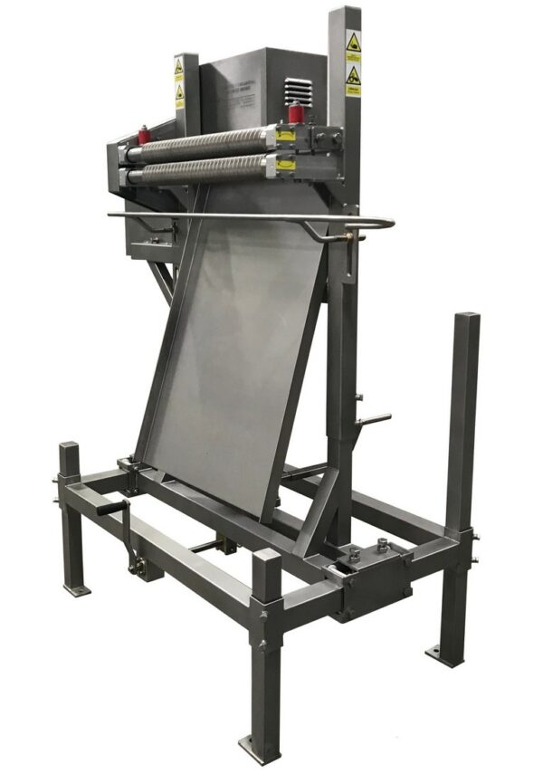 The basic element of the plucking machine construction is a frame on which two shafts for plucking the feathers are mounted. Height adjustment of the device is performed by means of a mechanical jack mounted in the lower part of the plucking machine. The process of plucking (removing) the tail feathers should take place when the carcass is already scalded. The plucking machine is equipped with a separate conveyor mechanism (driven from the overhead slaughter conveyor), whose task is to position the stirrups on which the carcasses are suspended during tail feather removal. In addition, the machine is equipped with a compressed air system from a side-channel blower and a knife nozzle, whose task is to assist, by the force of the air jet, the insertion of the tail feathers between the plucking rollers.